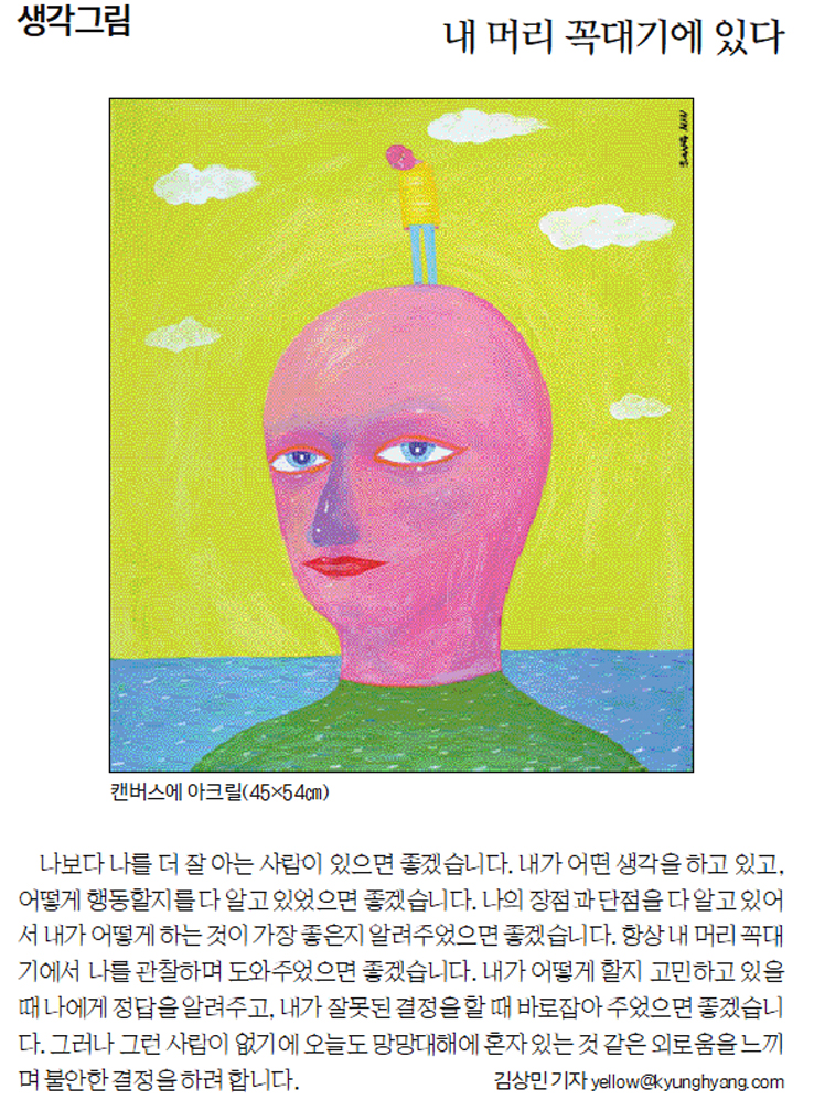 나 보다 나를 더 잘 아는 사람이 있으면 좋겠습니다. 내가 어떤 생각을 하고 있고, 어떻게 행동할 것이라는 것을 다 알고 있었으면 좋겠습니다. 나의 장점과 단점을 다 알고 있어서 내가 어떻게 하는 것이 가장 좋은 것인지 알려 주었으면 좋겠습니다. 항상 내 머리 꼭대기에서 나를 관찰하며 나를 도와주었으면 좋겠습니다. 내가 어떻게 할지 고민하고 있을 때 나에게 정답을 가르쳐 주고, 내가 잘못된 결정을 할 때 바로잡아 주었으면 좋겠습니다. 그러나 그런 사람이 없기에 오늘도 망망대해에 혼자 있는 것 같은 외로움을 느끼며 불안한 결정을 하려 합니다.