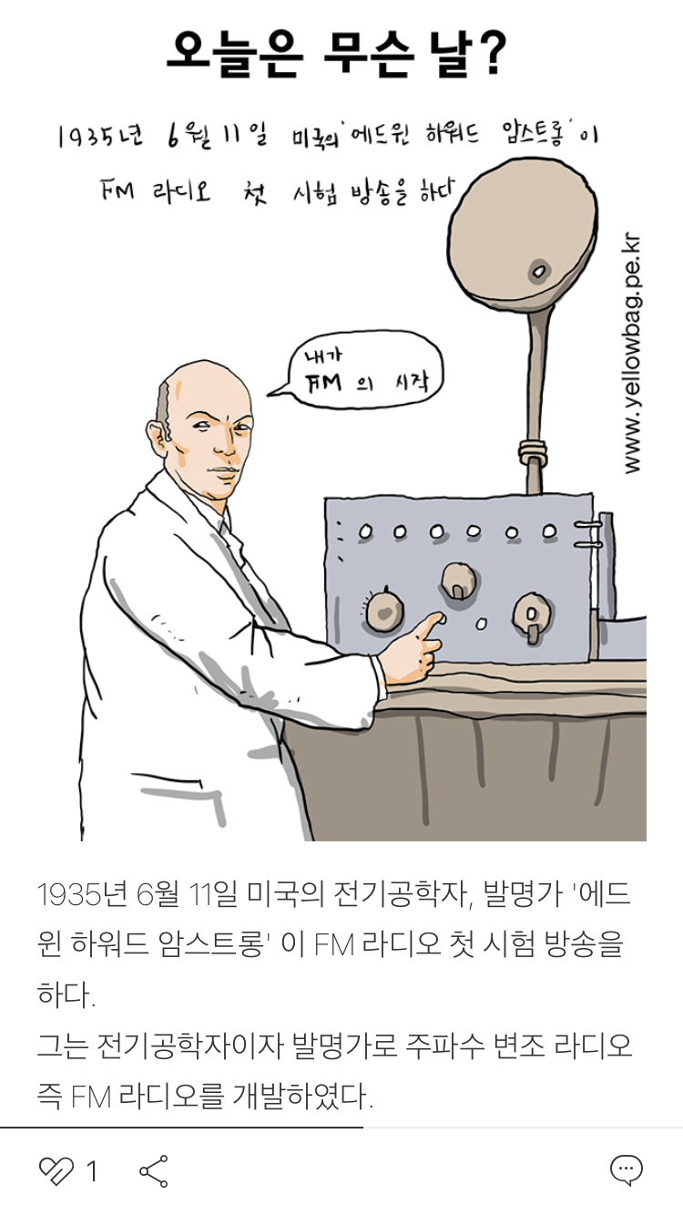 세상이야기 6월11일 노랑가방 2021. 6. 11. 08:09 그는 전기공학자이자 발명가로 주파수 변조 라디오 즉 FM 라디오를 개발하였다. 공유하기 게시글 관리 노랑가방의그림이야기 '세상이야기' 카테고리의 다른 글 6월13일 (0) 2021.06.13 6월12일 (0) 2021.06.12 6월10일 (0) 2021.06.10 6월9일 (0) 2021.06.09 6월8일 (0) 2021.06.08 '세상이야기' Related Articles 6월13일 6월12일 6월10일 6월9일