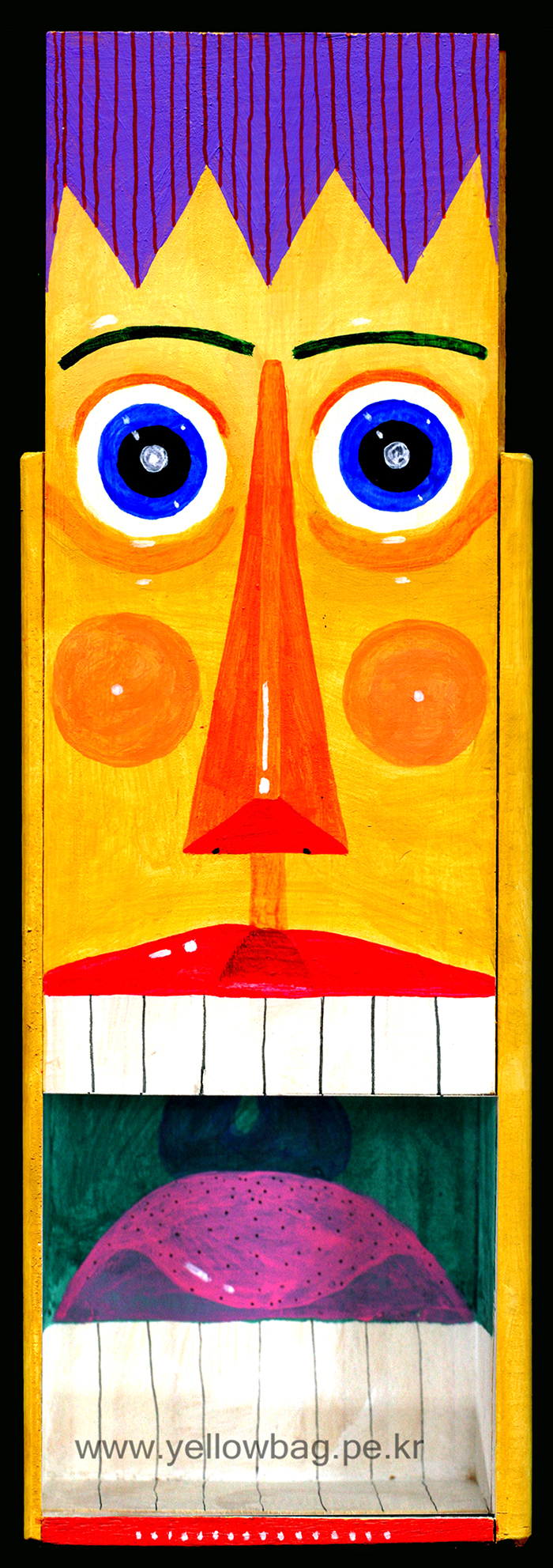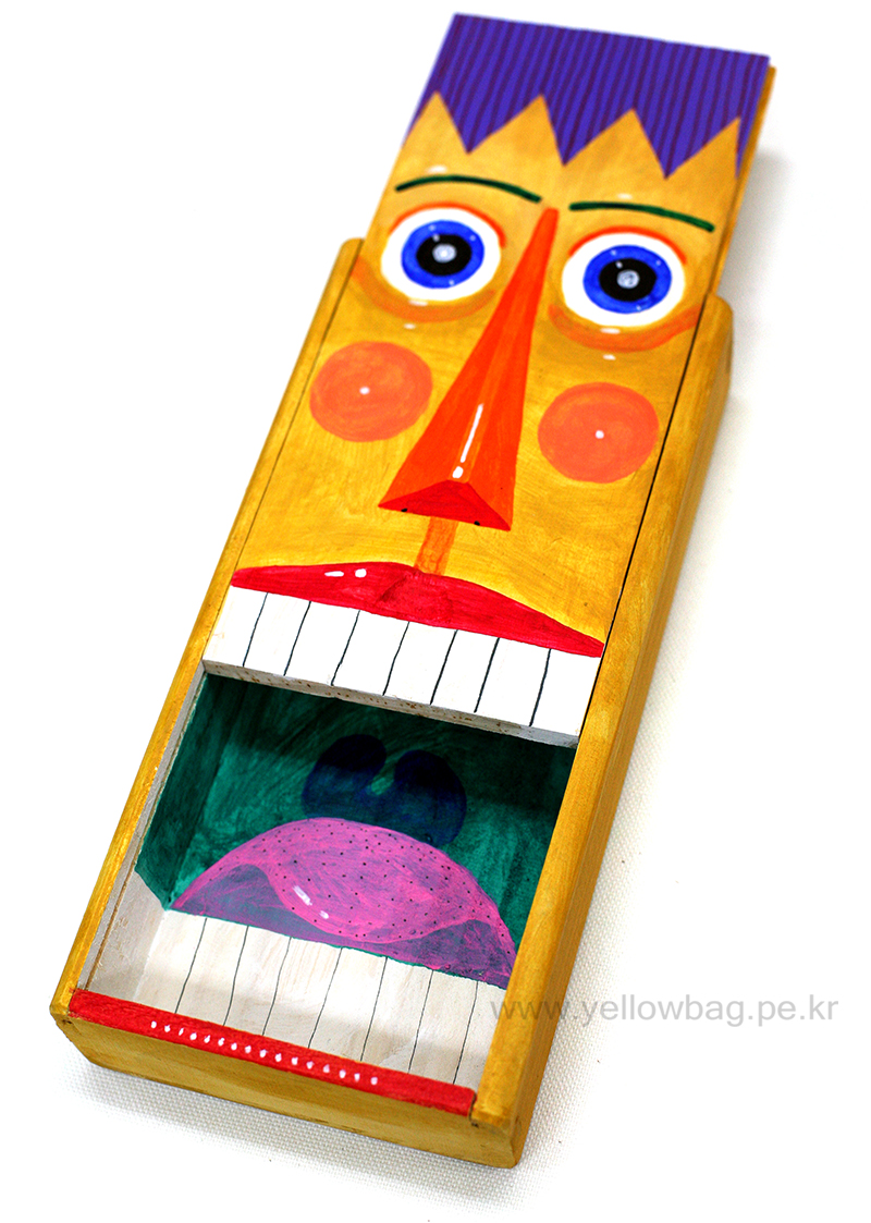 길에서 뚜껑이 열려있는 나무필통을 발견했습니다. 가만히 쳐다보니 입을 크게 벌려 외치고 있는 사람 같아서 그렇게 필통 위에 그림을 그려보았습니다. 필통 뚜껑을 움직이면 입도 닫았다 열었다 할 수 있습니다. 모든 사물에는 저마다의 표정이 숨겨져 있는 것 같습니다. 구름 속에도, 얼룩진 벽지에도, 나무 무늬에도, 녹슨 고철더미에도 자기들만의 표정이 숨겨져 있습니다. 나의 기분대로 나의 느낌대로 그 표정들도 따라 바뀌어 보입니다. 그런 숨겨진 표정을 찾아내는 것도 큰 재미입니다.