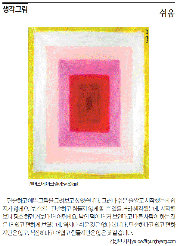단순하고 예쁜 그림을 그려보고 싶었습니다. 그러나 쉬운 줄 알고 시작했는데 쉽지가 않네요. 보기에는 단순하고 힘들지 않게 할 수 있을 거라 생각했는데, 시작해 보니 평소 하던 거보다 더 어렵네요. 남의 떡이 더 커 보인다고 다른 사람이 하는 것은 더 쉽고 편하게 보였는데, 역시나 쉬운 것은 없나 봅니다. 단순하다고 쉽고 편하지만은 않고, 복잡하다고 어렵고 힘들지만은 않은 것 같습니다.