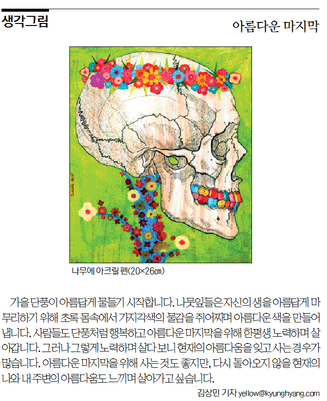 가을 단풍이 아름답게 물들기 시작합니다. 나뭇잎들은 자신의 죽음을 아름답게 마무리하기 위해 초록 몸속에서 가지각색의 물감을 쥐어짜며 아름다운 색을 만들어 냅니다. 사람들도 단풍처럼 행복하고 아름다운 마지막을 위해서 한 평생 노력하며 살아갑니다. 그러나 그렇게 노력하며 살다 보니 현재의 아름다움을 잊고 살아가는 경우가 많습니다. 아름다운 마지막을 위해 사는 것도 좋지만, 다시 돌아오지 않을 현재의 나와 내 주변의 아름다움도 느끼며 살아가고 싶습니다.