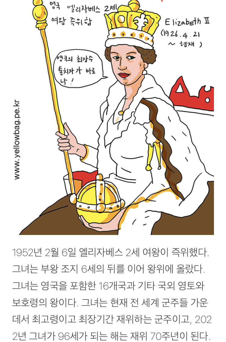 1952년 2월 6일 엘리자베스 2세 여왕이 즉위했다. 그녀는 부왕 조지 6세의 뒤를 이어 왕위에 올랐다. 그녀는 영국을 포함한 16개국과 기타 국외 영토와 보호령의 왕이다. 그녀는 현재 전 세계 군주들 가운데서 최고령이고 최장기간 재위하는 군주이고, 2022년 그녀가 96세가 되는 해는 재위 70주년. 2022년 9월8일 죽음