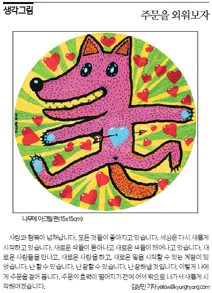 사랑과 행복이 넘쳐 납니다. 모든 것들이 좋아지고 있습니다. 세상은 다시 새롭게 시작하고 있습니다. 새로운 새싹들이 돋아나고 새로운 색들이 태어나고 있습니다. 새로운 사람들을 만나고, 새로운 사랑을 하고, 새로운 일을 시작할 수 있는 계절이 되었습니다. 난 할 수 있습니다. 난 잘할 수 있습니다. 난 잘 해낼 것입니다. 이렇게 나에게 주문을 걸어 봅니다. 주문의 효력이 떨어지기 전에 어서 밖으로 나가서 새롭게 시작해야겠습니다.