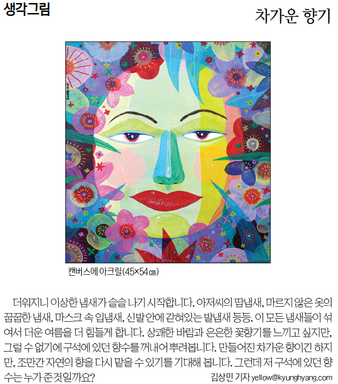 더워지니 이상한 냄새가 슬슬 나기 시작합니다. 아저씨의 땀냄새, 마르지 못한 옷의 쉰 냄새, 마스크 속 입냄새, 어디선가 피어나는 담배냄새, 갇혀있는 신발 속 발 냄새 등등. 이 모든 냄새들이 섞여서 더운 여름을 더 힘들게 합니다. 상쾌한 바람과 은은한 꽃향기를 느끼고 싶지만, 그럴 수 없기에 구석에 있던 향수를 꺼내어 뿌려 봅니다. 만들어진 차가운 향이긴 하지만, 조만간 자연의 향을 다시 맡을 수 있기를 기대해 봅니다. 그런데 저 구석에 있던 향수는 누가 준 것일까요?