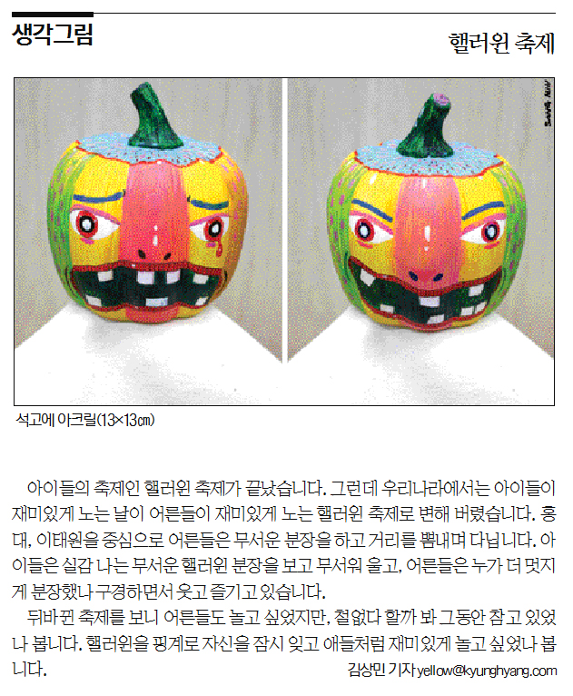아이들의 축제인 할로윈 축제가 끝났습니다. 그런데 우리나라에서는 아이들이 재미있게 노는 날이 어른들이 재미있게 노는 할로윈 축제로 변해 버렸습니다. 홍대, 이태원을 중심으로 어른들은 무서운 분장을 하고 거리를 뽐내며 다닙니다. 아이들은 실감 나는 무서운 할로윈 분장을 보고 무서워 울고, 어른들은 누가 더 멋지게 분장했나 구경하면서 웃고 즐기고 있습니다. 뒤바뀐 축제를 보니 어른들도 놀고 싶었지만, 철없다 할까 봐 그동안 참고 있었나 봅니다. 할로윈을 핑계로 자신을 잠시 잊고 애들처럼 재미있게 놀고 싶었나 봅니다.