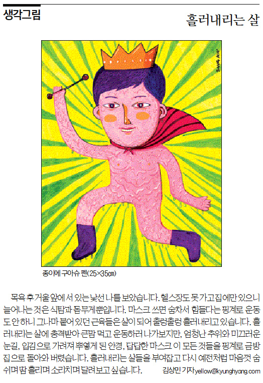 목욕 후 거울 앞에 서있는 낯선 나를 보았습니다. 헬스장도 못 가고 집에만 있으니 늘어나는 것은 식탐과 몸무게뿐입니다. 마스크 쓰면 숨차서 힘들다는 핑계로 운동도 안 하니 그나마 붙어있던 근육들은 살이 되어 출렁출렁 흘러내리고 있습니다. 흘러내리는 살에 충격받아 큰 맘먹고 운동하러 나가보지만, 엄청난 추위와 미끄러운 눈길, 입김으로 가려져 뿌옇게 된 안경, 답답한 마스크 이 모든 것들을 핑계로 금방 집으로 돌아와 버렸습니다. 흘러내리는 살들을 부여잡고 다시 예전처럼 마음껏 숨 쉬며 땀 흘리며 소리치며 달려보고 싶습니다.
