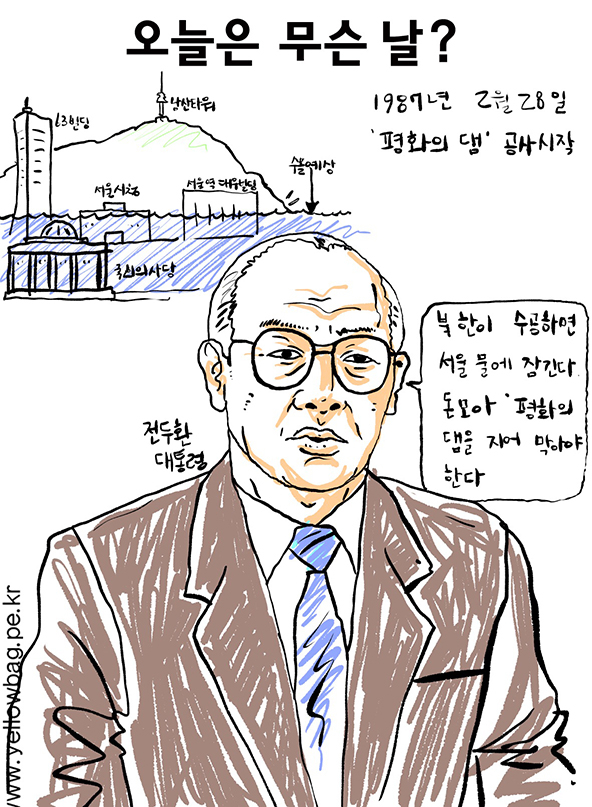 1989년 1월에 1차 완공하였고 그 뒤 2002년 2단계 증축 공사하여 2005년 10월에 완공하였다. 건설과정에서 전두환 정권은 북한의 수공을 과장하고 불안감을 조성하여 댐을 정치적으로 이용한 것이 밝혀져 대국민 사기극이라는 비판을 받았다. 공사비는 1700억 원이고 이중 639억여 원은 국민성금으로 충당하였는데 모금 과정에서 횡령 사례가 발생하였고, 전두환 정권은 기업의 매출에 따라 최소 700만 원에서 최대 10억 원을 강제로 할당하였다고 한다.