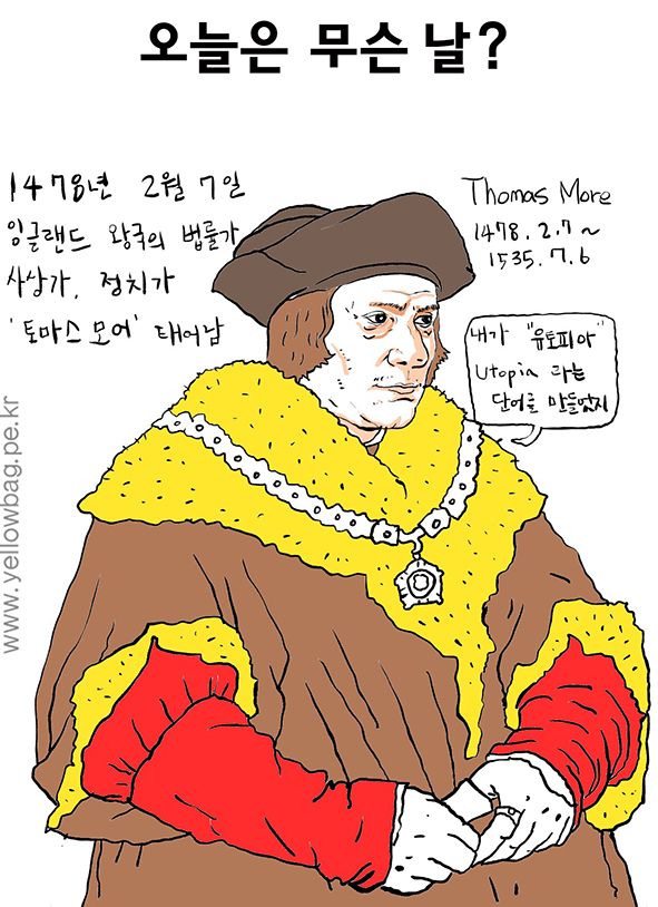 세상이야기 2월7일 노랑가방 2021. 2. 7. 09:00 그는 인문주의자로 덕망이 높았고 대법관을 포함하여 여러 관직도 역임했다. 그는 헨리 8세가 주장한 잉글랜드 교회에서의 왕위 지상권을 받아들일 것을 거부한 죄로 반역죄로 처형당했다. 그가 죽은 400년 후 1935년 교황 비오 11세는 토머스 모어를 정치가의 수호성인으로 선언되었다. 공유하기 게시글 관리 노랑가방의그림이야기 '세상이야기' 카테고리의 다른 글 2월8일 (0) 2021.02.09 2월9일 (0) 2021.02.08 2월6일 (0) 2021.02.06 점프 (0) 2021.02.06 2월5일 (0) 2021.02.05 '세상이야기' Related Articles 2월8일 2월9일 2월6일 점프