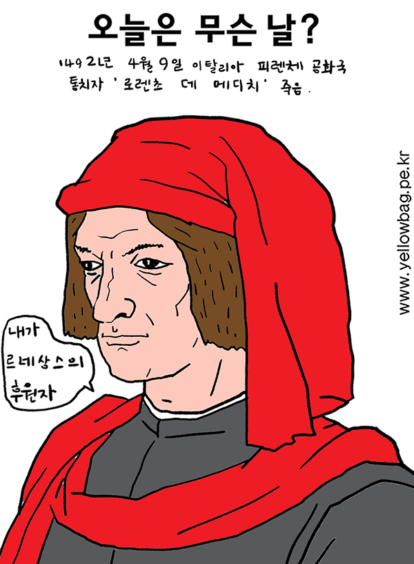 1492년 4월 8일 이탈리아 피렌체 공화국의 통치자, 르네상스의 열렬한 후원가 로렌초 데 메디치 죽음