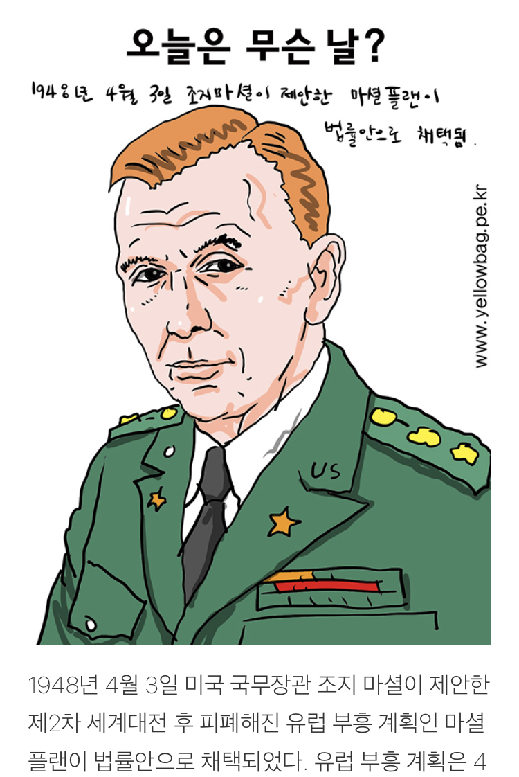 1948년 4월 3일 미국 국무장관 조지 마셜이 제안한 제2차 세계대전 후 피폐해진 유럽 부흥 계획인 마셜플랜이 법률안으로 채택되었다. 유럽 부흥 계획은 4년 동안 총 130억 달러(현재가치 약 1300억 달러)에 해당되는 경제적, 기술적 지원을 해주었다. 원조가 끝난 후 독일을 제외한 모든 국가의 경제력은 전쟁 전 수준으로 회복되었다. 또 유럽 내 각국 간의 관세 거래 장벽을 철폐하고 각국의 경제 수준을 맞추기 위해 설치한 기구 등을 통해 유럽 통화화의 계기가 되었다. 이 계획을 제안한 조지 캐틀렛 마셜은 제2차 세계대전 때 미. 영 합동 참모본부의 최고 수뇌가 되어 북프랑스 상륙 작전을 지휘하였고, 1947년 국무장관이 도자 마셜 계획을 제안했다. 그는 마셜플랜 덕분에 1953년 노벨 평화상을 받았다.