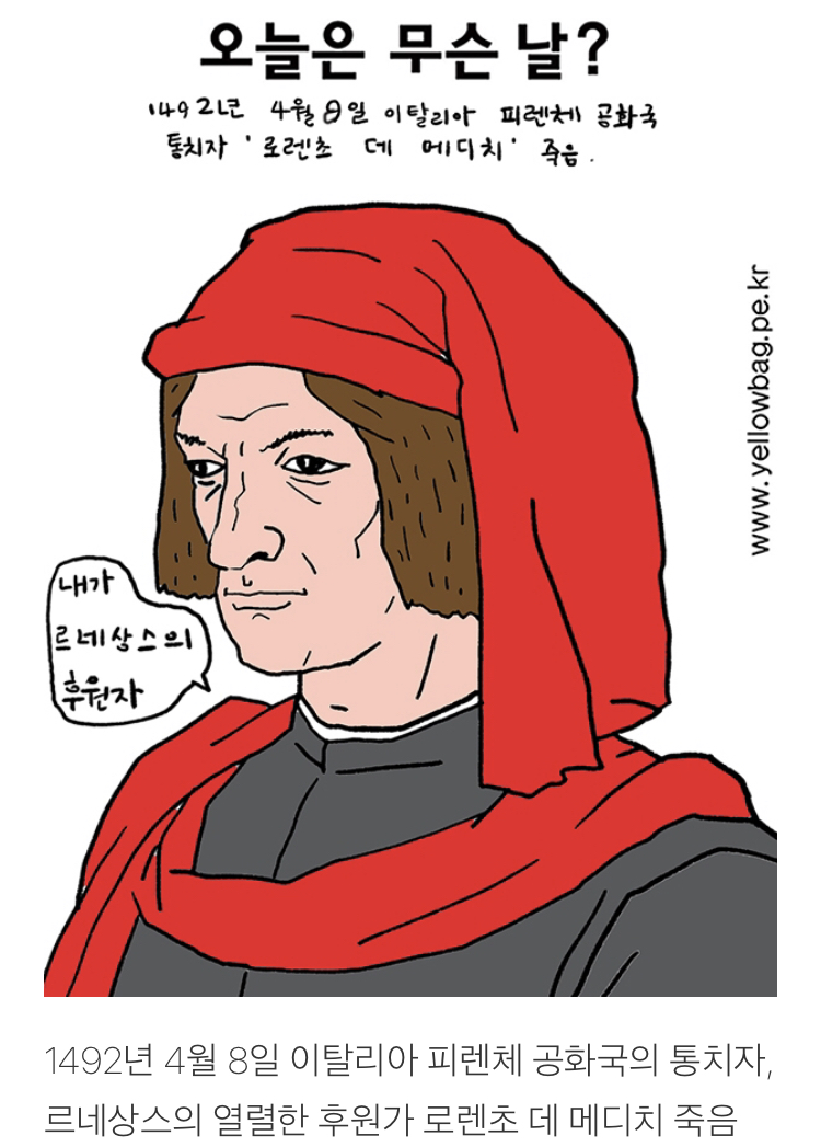 세상이야기 4월8일 노랑가방 2021. 4. 7. 23:41 그는 보티첼리와 미켈란젤로 같은 예술가들을 후원한 르네상스의 후원자 였다. 그의 생애는 이탈리아 르네상스의 절정기와 일치하고 그의 죽음은 피렌체 황금기의 종말과 동시에 일어났다. 그가 유지하는데 도움을 줬던 여러 이탈리아 국가들과 맺은 부서지기 쉬웠던 평화는 그의 죽음으로 붕괴되었다. 공유하기 게시글 관리 노랑가방의그림이야기 '세상이야기' 카테고리의 다른 글 4월10일 (0) 2021.04.10 4월9일 (0) 2021.04.09 4월6일 (0) 2021.04.07 4월6일 (0) 2021.04.06 4월4일 (0) 2021.04.04 '세상이야기' Related Articles 4월10일 4월9일 4월6일 4월6일