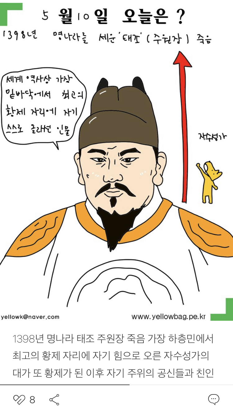 세상이야기 5월10일 노랑가방 2021. 5. 10. 08:52 1398년 명나라 태조 주원장 죽음 가장 하층민에서 최고의 황제 자리에 자기 힘으로 오른 자수성가의 대가 또 황제가 된 이후 자기 주위의 공신들과 친인척을 모두 숙청해 버린 숙청의 대가 공유하기 게시글 관리 노랑가방의그림이야기 '세상이야기' 카테고리의 다른 글 5월12일 (0) 2021.05.12 5월11일 (0) 2021.05.11 5월9일 (0) 2021.05.09 5월8일 (0) 2021.05.08 5월7일 (0) 2021.05.07 '세상이야기' Related Articles 5월12일 5월11일 5월9일 5월8일