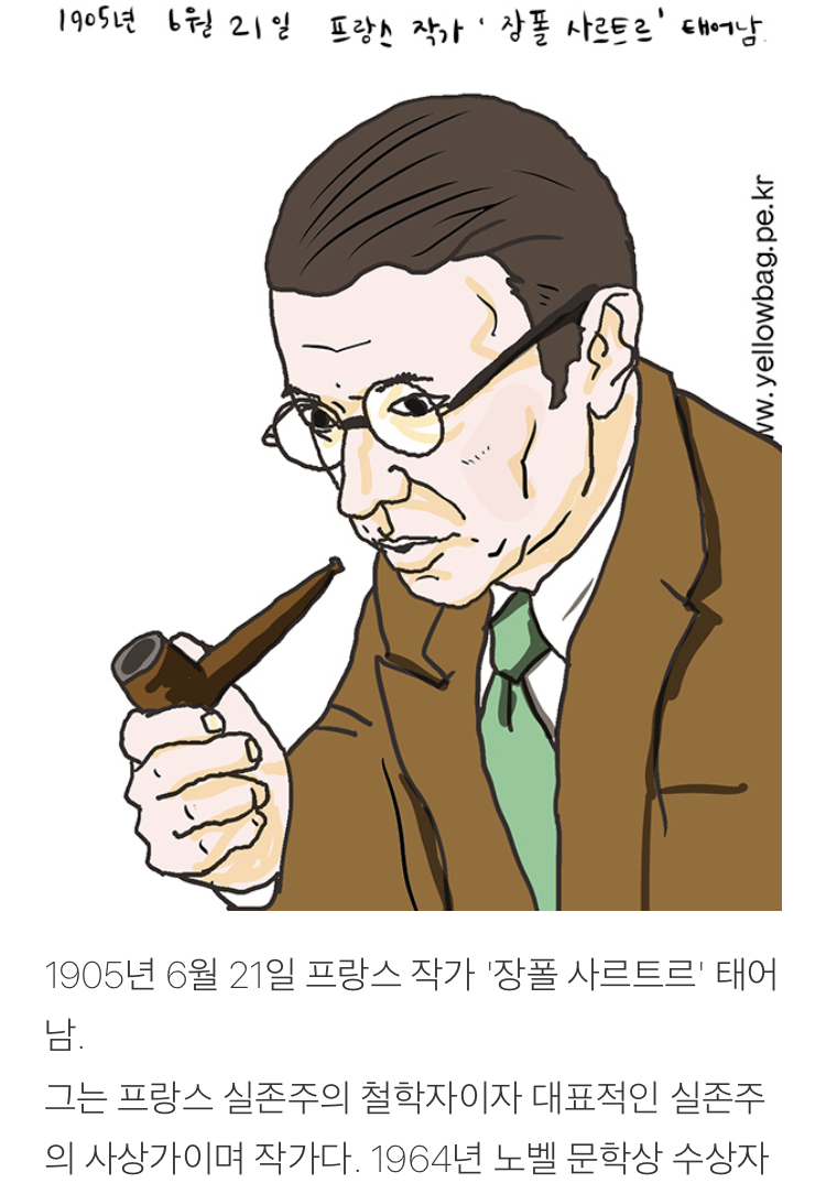 그는 프랑스 실존주의 철학자이자 대표적인 실존주의 사상가이며 작가다. 1964년 노벨 문학상 수상자로 결정되었으나 수상을 거부하였다. 그는 <실존주의는 휴머니즘이다>라는 조그만 책자에서 그의 실존주의 사상을 이렇게 설명했다. 행동적인 지식인 사르트르는 세계평화 문제에 대해서도 깊은 관심을 가졌다. 한국의 시인 김지하가 국가보안법 위반 및 내란선동죄 혐의로 체포되고 사형 선거까지 받게 되었을 때 김지하의 시 <오적> 번역본을 받아 보고 곧바로 석방 호소문에 서명을 해주었다. 그다음 해 2월에 김지하는 풀려났다. 사르트르는 1968년 프랑스 5월 혁명에서 청년들에게 정치에 적극 첨 여할 것을 권했고, 그를 체포할 것을 권하는 참모들에게 당시 드골 대통령은 '볼테르를 바스티유에 넣을 수는 없다'며 사르트르의 체포를 말렸다는 일화도 있다.