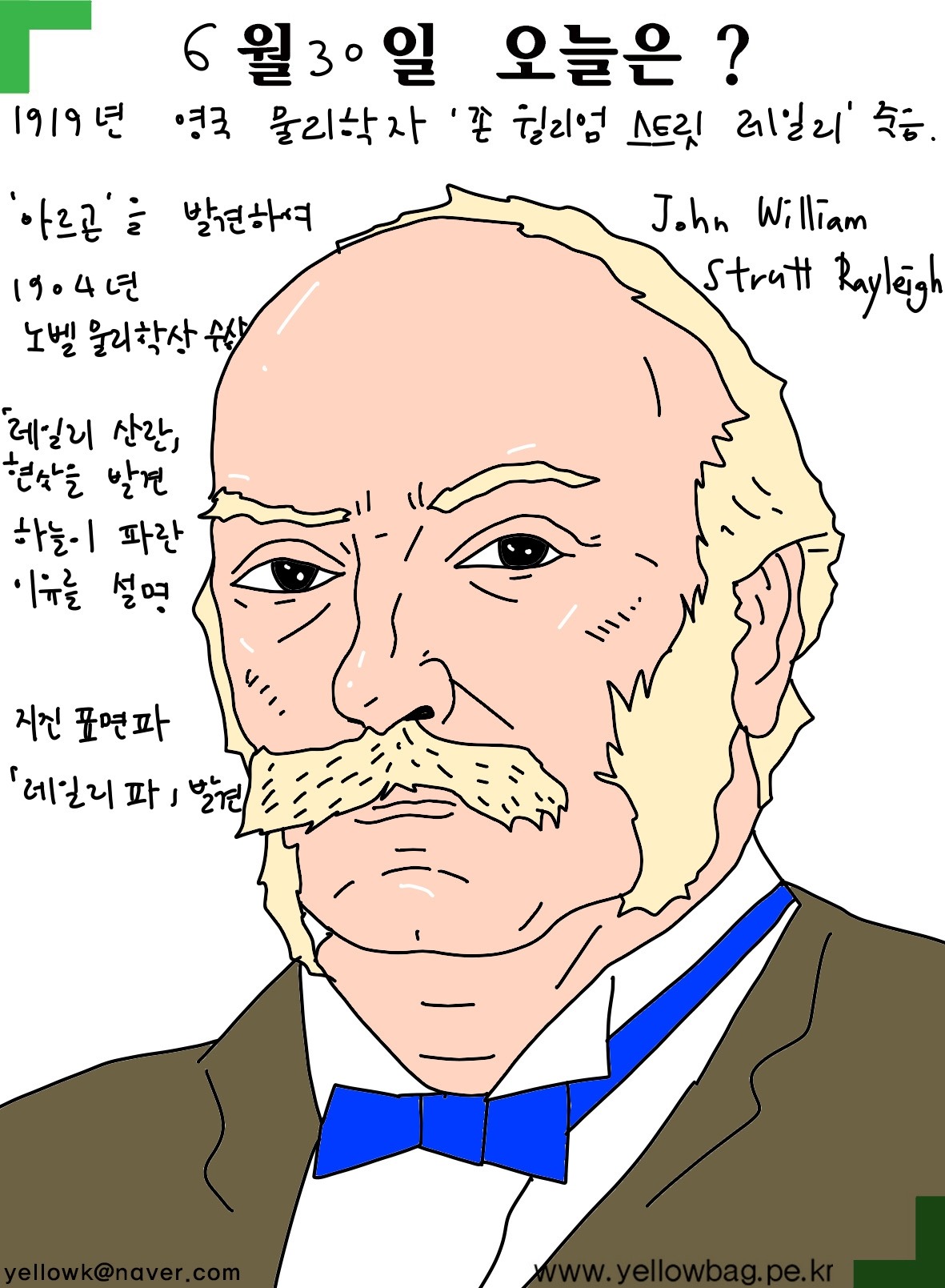 -하늘색이 파란이유를 설명하는 레일리현상을 발견ㅡ파란빛이 붉은빛 보다 더 많이 산란되기 때문, 해질무렵 해뜰무렵 태양빛이 더 먼거리를 통과해야 하기 때문에 푸른빛이 거의 다 산란되어 없어지고 붉은짗이나 주황색을 뜨게 됨