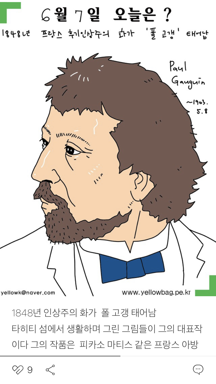세상이야기 6월7일 노랑가방 2021. 6. 7. 10:09 타히티 섬에서 생활하며 그린 그림들이 그의 대표작이다 그의 작품은 피카소 마티스 같은 프랑스 아방가드르 작가들에게 영감을 주었다 공유하기 게시글 관리 노랑가방의그림이야기 '세상이야기' 카테고리의 다른 글 6월9일 (0) 2021.06.09 6월8일 (0) 2021.06.08 6월6일 (0) 2021.06.06 6월5일 (0) 2021.06.05 6월4일 (0) 2021.06.04 '세상이야기' Related Articles 6월9일 6월8일 6월6일 6월5일