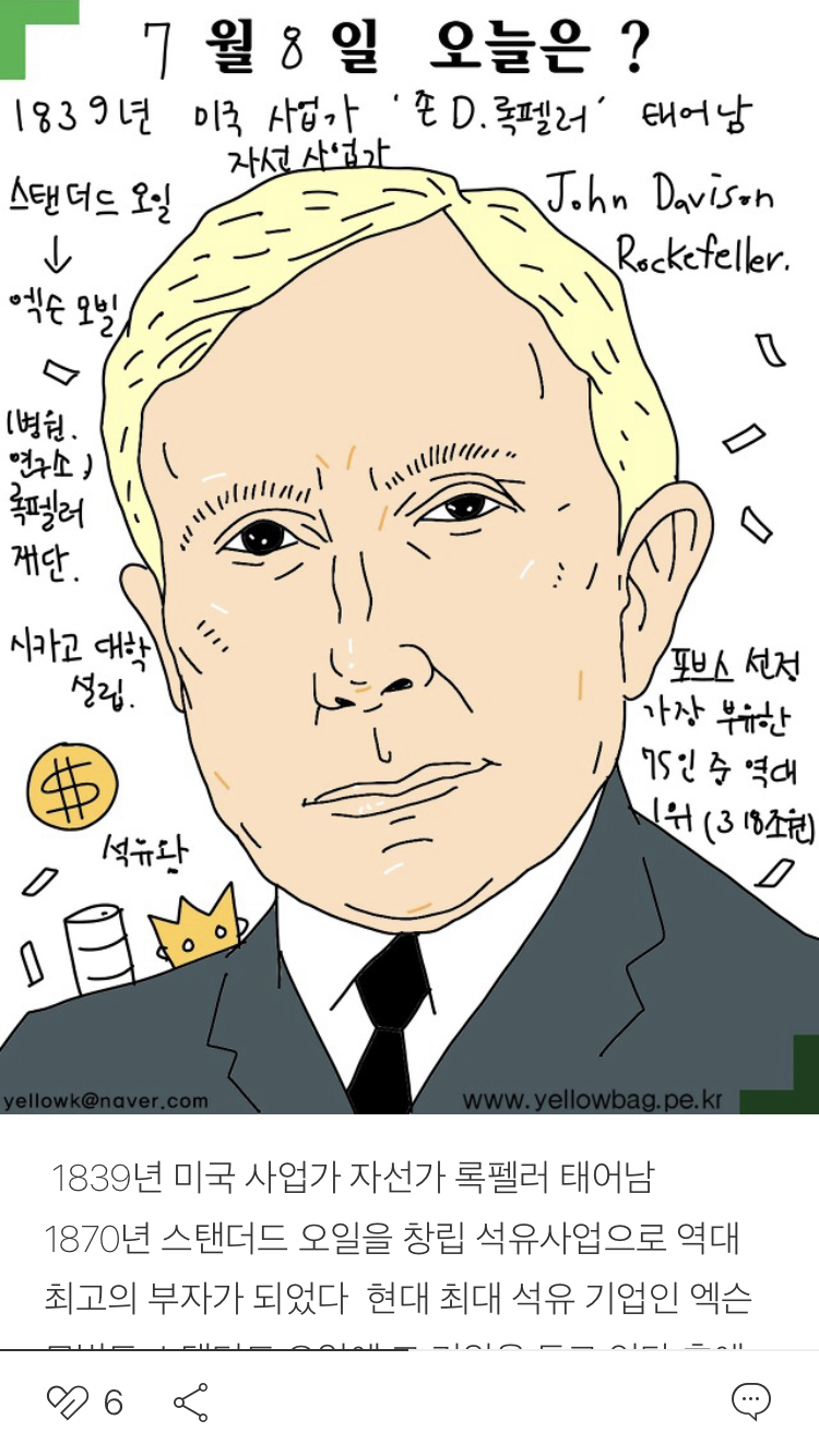 오늘은 무슨 날? 7월8일 노랑가방 2021. 7. 8. 07:08 1870년 스탠더드 오일을 창립 석유사업으로 역대 최고의 부자가 되었다 현대 최대 석유 기업인 엑슨모빌도 스탠더드 오일에 그 기원을 두고 있다.후에 은퇴하고 자선사업에 몰두하여 시카고 대학을 설립하고, 록펠러 재단을 만들어 병원, 의학연구소, 학교등 문화사업에 전념함 공유하기 게시글 관리 노랑가방의그림이야기 '오늘은 무슨 날?' 카테고리의 다른 글 7월9일 (0) 2021.07.10 7월9일 (0) 2021.07.09 7월7일 (0) 2021.07.07 7월1일 (0) 2021.07.01 6월 10일 오늘은 무슨 날 (0) 2019.06.10 '오늘은 무슨 날?' Related Articles 7월9일 7월9일 7월7일 7월1일