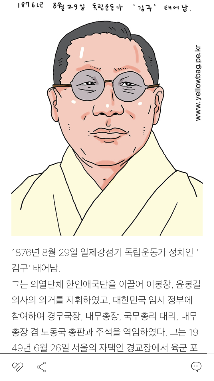 오늘은 무슨 날? 8월29일 노랑가방 2021. 8. 29. 17:53 그는 의열단체 한인애국단을 이끌어 이봉창, 윤봉길 의사의 의거를 지휘하였고, 대한민국 임시 정부에 참여하여 경무국장, 내무총장, 국무총리 대리, 내무총장 겸 노동국 총판과 주석을 역임하였다. 그는 1949년 6월 26일 서울의 자택인 경교장에서 육군 포병 소위 안두희에게 총격을 받고 74세의 나이로 사망하였다. 아직 그의 암살을 사주한 배후세력이 누구인지는 모른다. 공유하기 게시글 관리 노랑가방의그림이야기 '오늘은 무슨 날?' 카테고리의 다른 글 8월8일 고양이의 날 (0) 2022.08.08 8월30일 (0) 2021.08.30 8월26일 (0) 2021.08.26 8월25일 (0) 2021.08.25 8월24일 (0) 2021.08.24 '오늘은 무슨 날?' Related Articles 8월8일 고양이의 날 8월30일 8월26일 8월25일