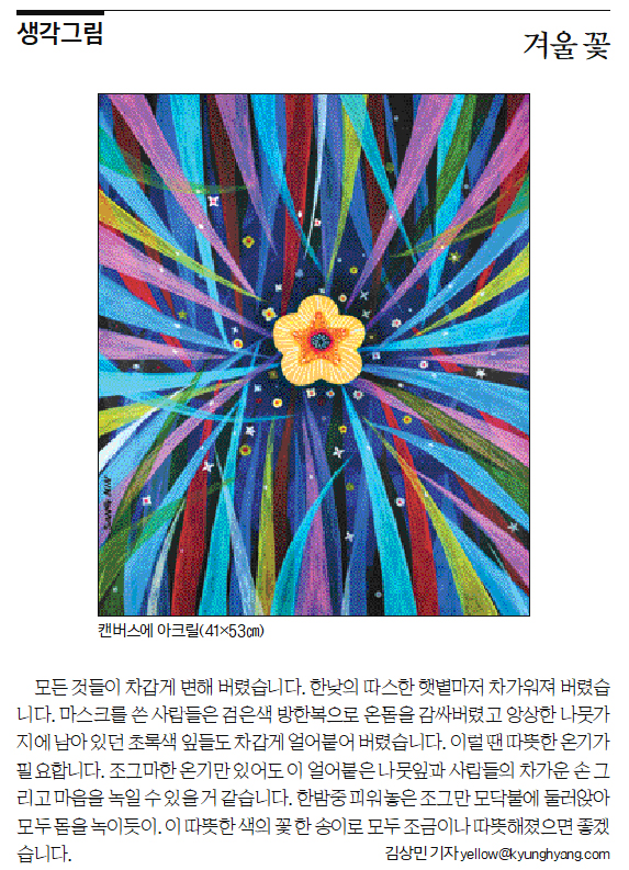 모든 것들이 차갑게 변해 버렸습니다. 한낮의 따스한 햇볕마저 차가워져 버렸습니다. 마스크를 쓴 사람들은 검은색 방한복으로 온몸을 감싸버렸고 앙상한 나뭇가지에 남아있던 초록색 잎들도 차갑게 얼어붙어 버렸습니다. 이럴 땐 따뜻한 온기가 필요합니다. 조그마한 온기만 있어도 이 얼어붙은 나뭇잎과 사람들의 차가운 손 그리고 마음을 녹일 수 있을 거 같습니다. 한밤중 피워놓은 조그만 모닥불에 둘러앉아 모두 몸을 녹이듯이. 이 따뜻한 색의 꽃 한 송이로 모두 조금이나 따뜻해졌으면 좋겠습니다.