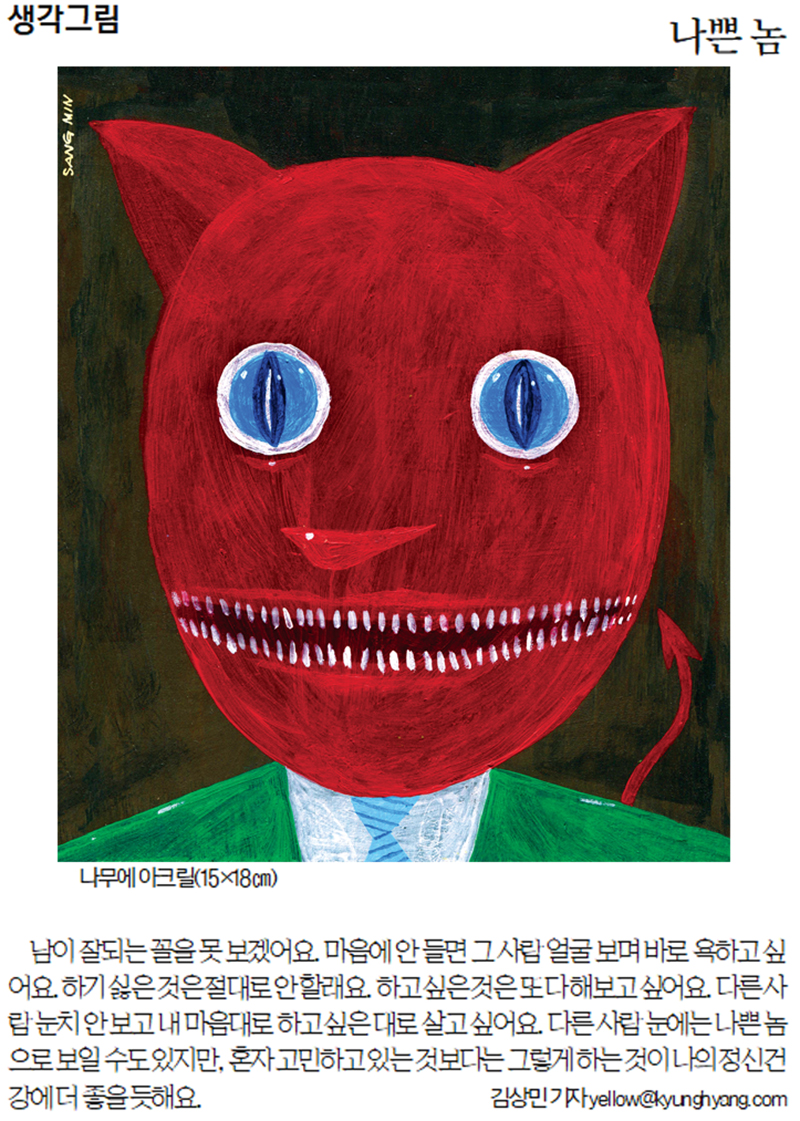 남이 잘되는 꼴을 못 보겠어요. 마음에 안 들면 그 사람 얼굴 보며 바로 욕하고 싶어요. 하기 싫은 것은 절대로 안 할래요. 하고 싶은 것은 또 다 해보고 싶어요. 다른 사람 눈치 안 보고 내 마음대로 하고 싶은 대로 살고 싶어요. 다른 사람 눈에는 나쁜 놈으로 보일 수도 있지만, 혼자 고민하고 있는 것보다는 그렇게 하는 것이 나의 정신건강에 더 좋을 듯해요.