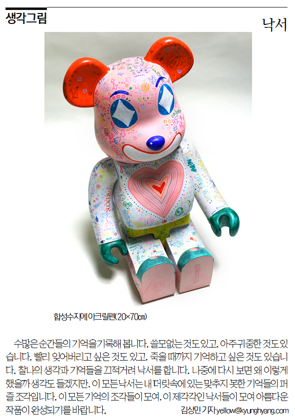 수많은 순간들의 기억을 기록해 봅니다. 쓸모없는 것들도 있고, 아주 귀중한 것도 있습니다. 빨리 잊어버리고 싶은 것들도 있고, 죽을 때까지 기억하고 싶은 것들도 있습니다. 찰나의 생각들과 기억들을 끄적거려 낙서를 합니다. 나중에 다시 보면 왜 이렇게 했을까 생각도 들겠지만, 이 모든 낙서들은 내 머릿속에 있는 맞추지 못한 기억들의 퍼즐 조각들입니다. 이 모든 기억의 조각들이 모여, 이 모든 제각각인 낙서들이 모여 아름다운 작품이 완성되기를 바랍니다.
