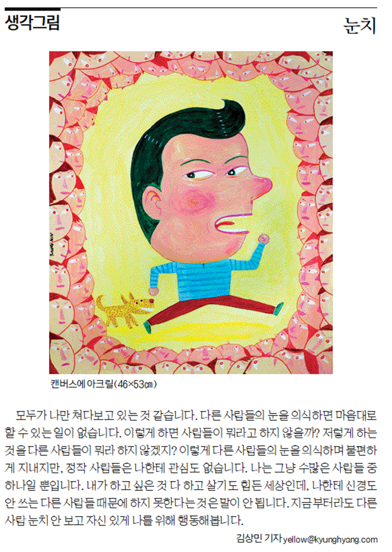 모두가 나만 쳐다보고 있는 것 같습니다. 다른 사람들의 눈을 의식하면 마음대로 할 수 있는 일이 없습니다. 이렇게 하면 사람들이 뭐라고 하지 않을까? 저렇게 하는 것을 다른 사람들이 뭐라 하지 않겠지? 이렇게 다른 사람들의 눈을 의식하며 불편하게 지내지만, 정작 사람들은 나한테 관심도 없습니다. 나는 그냥 수많은 사람들 중 하나일 뿐입니다. 내가 하고 싶은 것 다 하고 살기도 힘든 세상인데, 나한테 신경도 안 쓰는 다른 사람들 때문에 하지 못한다는 것은 말이 안 됩니다. 지금부터라도 다른 사람 눈치 안 보고 자신 있게 나를 위해 행동해봅니다.