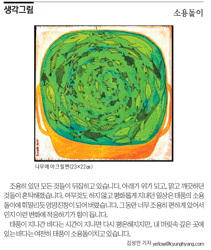 조용히 있던 모든 것들이 뒤집히고 있습니다. 아래가 위가 되고, 말고 깨끗하던 것들이 혼탁해졌습니다. 아무것도 안 하고 평화롭게 지내던 일상은 태풍의 소용돌이에 휘말리듯 엉망진창이 되어 버렸습니다. 그동안 너무 조용히 편하게 있어서 인지 이런 변화에 적응하기가 힘이 듭니다. 태풍이 지나간 바다는 시간이 지나면 다시 평온해지지만, 내 머릿속 깊은 곳에 있는 바다는 여전히 태풍이 소용돌이치고 있습니다.
