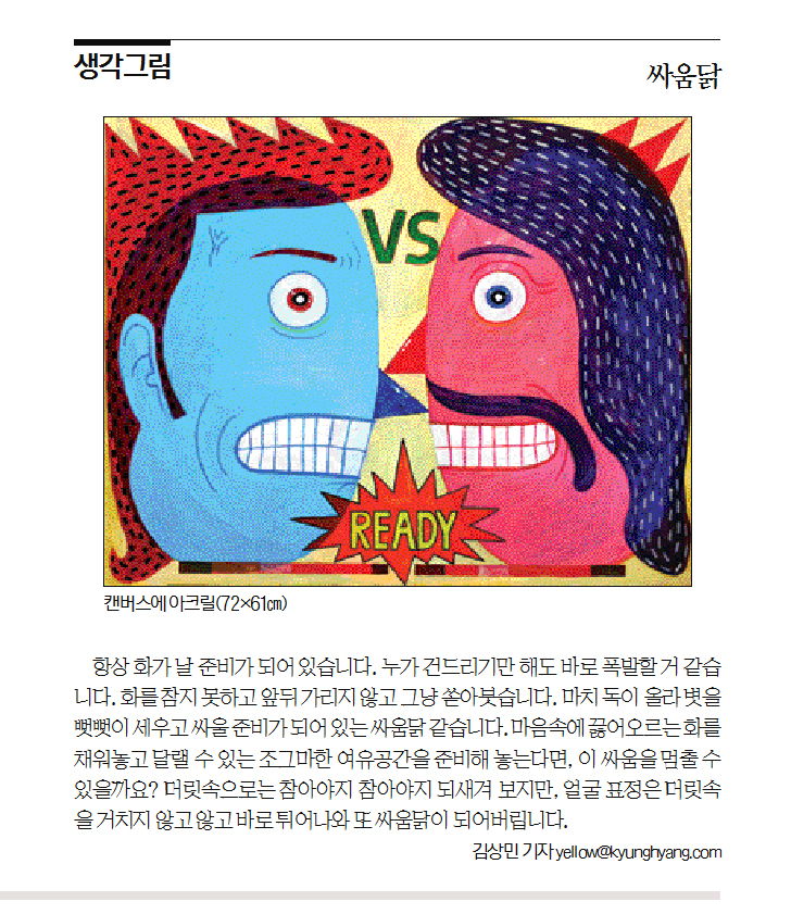 항상 화가 날 준비가 되어있습니다. 누가 건드리기만 해도 바로 폭발할 거 같습니다. 화를 참지 못하고 앞뒤 가리지 않고 그냥 쏟아붓습니다. 마치 독이 올라 벼슬을 빹빹이 세우고 싸울 준비가 되어 있는 싸움닭 같습니다. 마음속에 끓어오르는 화를 채워놓고 달랠 수 있는 조그마한 여유공간을 준비해 놓는다면, 이 싸움을 멈출 수 있을까요? 머릿속으로는 참아야지 참아야지 되새겨 보지만, 얼굴 표정은 머릿속을 거치지 않고 않고 바로 튀어나와 또 싸움닭이 되어버립니다.