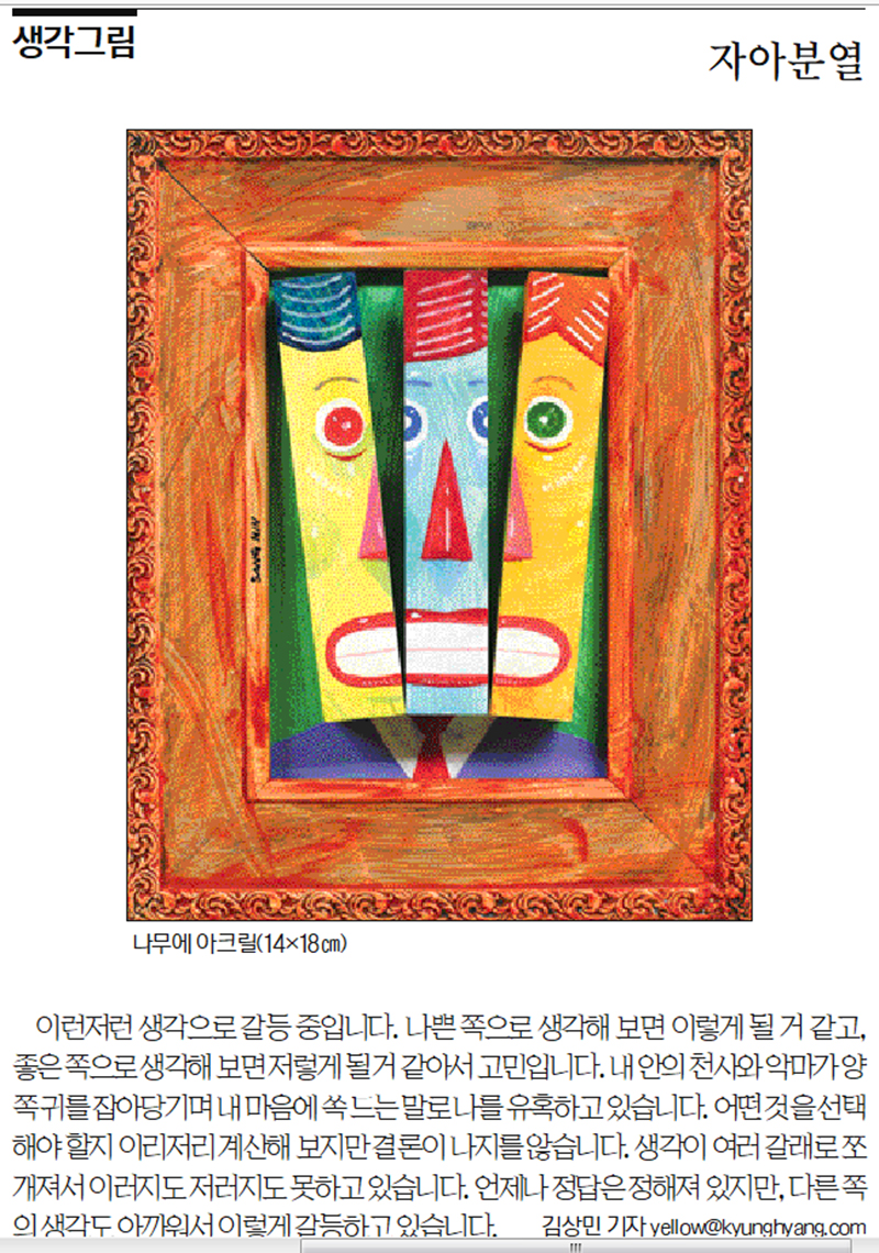 이런저런 생각으로 갈등 중입니다. 나쁜 쪽으로 생각해 보면 이렇게 될 거 같고, 좋은 쪽으로 생각해 보면 저렇게 될 거 같아서 고민입니다. 내 안에 천사와 악마가 양쪽 귀를 잡아당기며 내 마음에 쏙 드는 말로 나를 유혹하고 있습니다. 어떤 것을 선택해야 할지 이리저리 계산을 해보지만 결론이 나지를 않습니다. 생각은 여러 갈래로 쪼개져서 이러지도 저러지도 못하고 있습니다. 언제나 정답은 정해져 있지만, 다른 쪽의 생각도 아까워서 이렇게 갈등하고 있습니다.