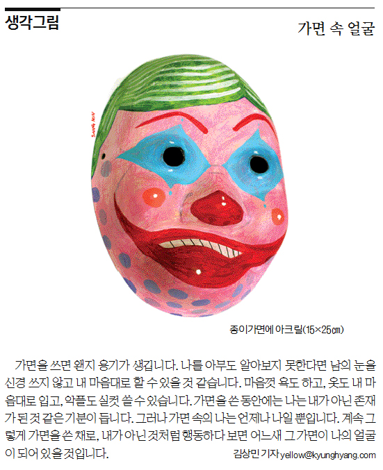 가면을 쓰면 왠지 용기가 생깁니다. 나를 아무도 알아보지 못한다면 남의 눈을 신경 쓰지 않고 내 마음대로 할 수 있을 것 같습니다. 마음껏 욕도 하고, 옷도 내 마음대로 입고, 악플도 실컷 쓸 수 있습니다. 가면을 쓴 동안에는 나는 내가 아닌 존재가 된 것 같은 기분이 듭니다. 그러나 가면 속의 나는 언제나 나일 뿐입니다. 계속 그렇게 가면을 쓴 채로, 내가 아닌 것처럼 행동하다 보면 어느 새 그 가면이 나의 얼굴이 되어 있을 것입니다