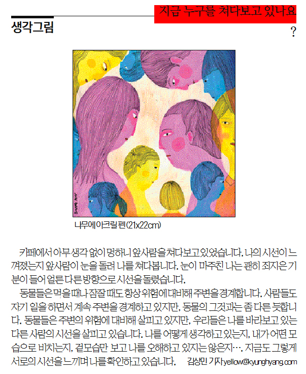 카페에서 아무 생각 없이 멍하니 앞사람을 쳐다보고 있었습니다. 나의 시선이 느껴졌는지 앞사람이 눈을 돌려 나를 쳐다봅니다. 눈이 마주친 나는 괜히 죄지은 기분이 들어 얼른 다른 방향으로 시선을 돌렸습니다. 동물들은 먹을 때나 잠잘 때도 항상 위험에 대비해 주변을 경계하고 있습니다. 사람들도 자기 일을 하면서 계속 주변을 경계하고 있지만, 동물의 그것과는 좀 다른 듯합니다. 동물들은 주변의 위험에 대비해 살피고 있지만, 우리들은 나를 바라보고 있는 다른 사람의 시선을 살피고 있습니다. 나를 어떻게 생각하고 있는지, 내가 어떤 모습으로 비치는지, 겉모습만 보고 나를 오해하고 있지는 않은지... 지금도 그렇게 서로의 시선을 느끼며 나를 확인하고 있습니다.