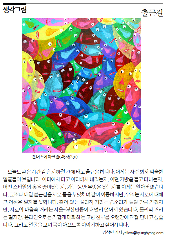 .오늘도 같은 시간 같은 지하철 칸에 타고 출근을 합니다. 이제는 자주 봐서 익숙한 얼굴들이 보입니다. 어디에서 타고 어디에서 내리는지, 어떤 가방을 들고 다니는지, 어떤 스타일의 옷을 좋아하는지, 가는 동안 무엇을 하는지를 이제는 알아버렸습니다. 그러나 매일 출근길을 서로 몸을 부딪치며 같이 이동하지만, 우리는 서로에 대해 그 이상은 알지를 못합니다. 같이 있는 물리적 거리는 숨소리가 들릴 만큼 가깝지만, 서로의 마음속 거리는 서울~부산만큼이나 멀리 떨어져 있습니다. 물리적 거리는 멀지만, 온라인으로는 가깝게 대화하는 고향 친구를 오랜만에 직접 만나고 싶습니다. 그리고 얼굴을 보며 목이 아프도록 이야기하고 싶어집니다.