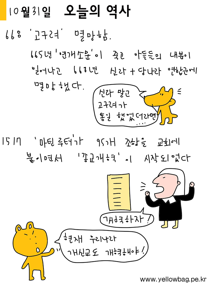 오늘의역사 10월31일오늘의역사 고구려 노랑가방 2019. 10. 31. 09:57 http://www.yellowbag.pe.kr/ https://www.instagram.com/yellowbag_min/ https://kimsangmin.creatorlink.net/