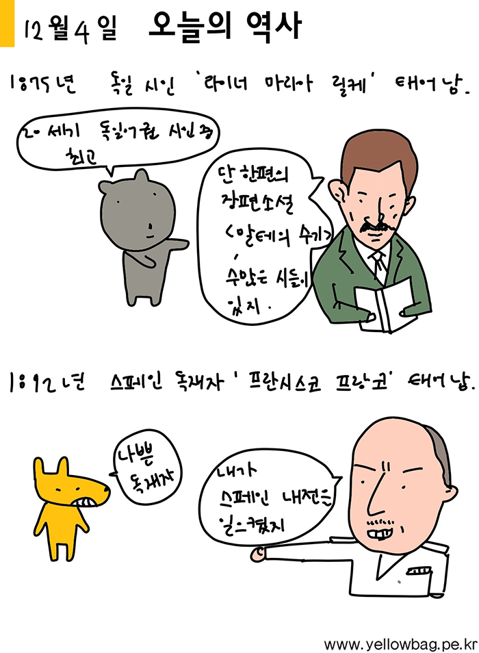 오늘의역사 12월4일오늘의역사 릴케 노랑가방 2019. 12. 4. 10:07 http://www.yellowbag.pe.kr/ https://www.instagram.com/yellowbag_min/ https://kimsangmin.creatorlink.net/ https://yellowbag.tistory.com/