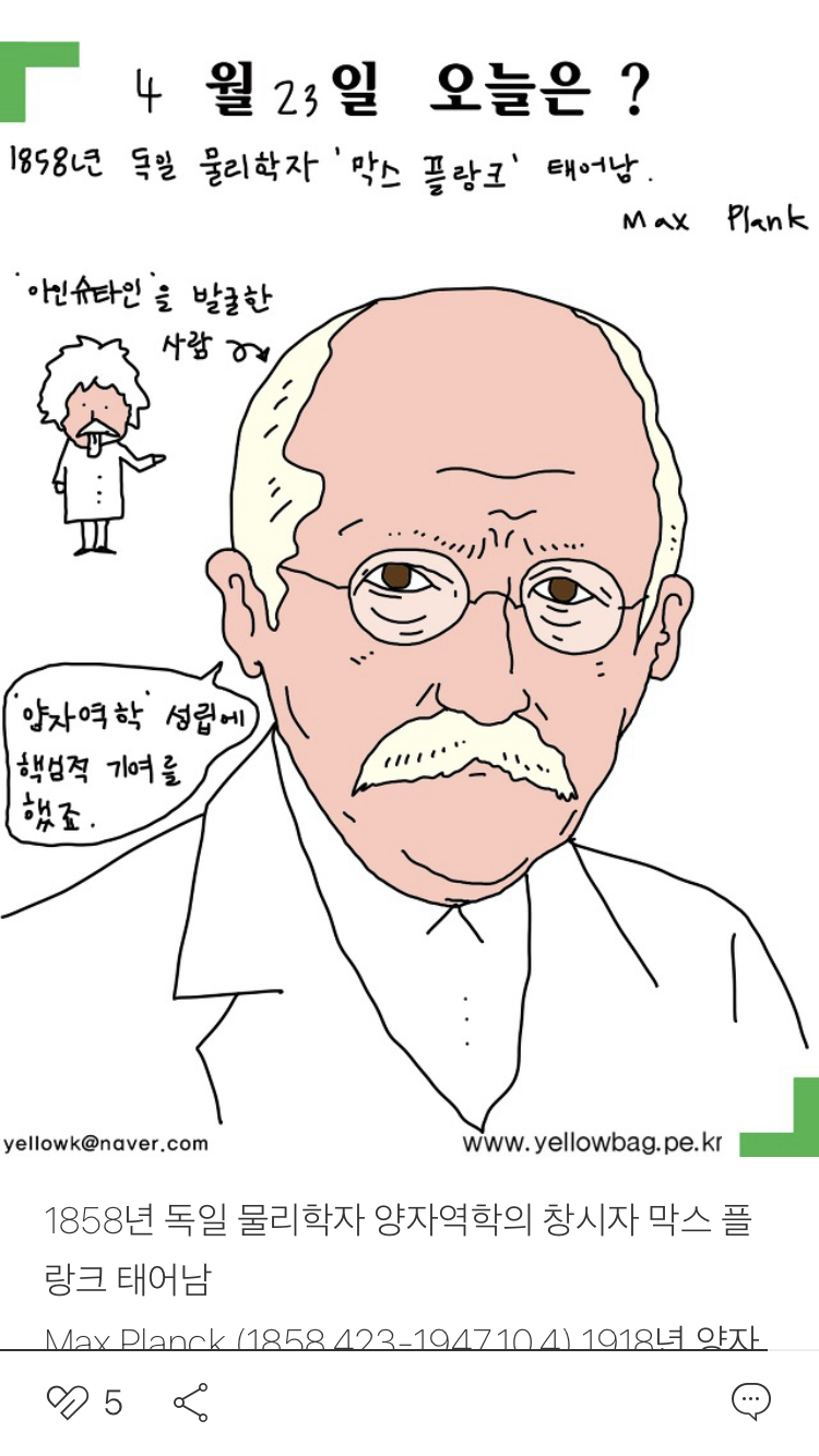Max Planck (1858.423-1947.10.4) 1918년 양자역학의 기초를 마련한 공로로 노벨 물리학상을 수상하였고, 플랑크 상수와 플랑크의 복사 법칙을 발견하였다. 그리고 당시 아마추어 과학자에 불과하던 아인슈타인을 발굴하였다.