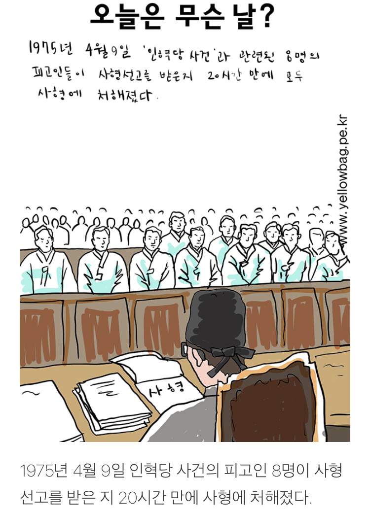 인혁당 사건은 박정희 정부 시절 중앙정보부가 민청학련이라는 지하조직이 사회 각계각층에 침투하여 인민혁명을 기도했다고 긴급조치 제4호를 공포하고 국가보안법 등 위반한 혐의로 많은 사람들이 영장 없이 체포되어 유신반대 성향이 있는 도예종 등이 기소, 사형된 사건이다. 이 사건은 국가가 법으로써 죄 없는 사람들을 죽인 사법살인으로 4월 9일 이날을 국제 사법계의 암흑의 날로 선포하였다. 2007년 대법원 재심에서 고문에 의한 날조사건이라는 사실을 들어 무죄평결이 내려져 피의자들의 명예가 회복되었다. 유가족들은 국가를 상대로 손해배상청구소송을 하였고 시국사건상 최대의 배상 액수 637억여 억 원을 지급하라 판결했다.