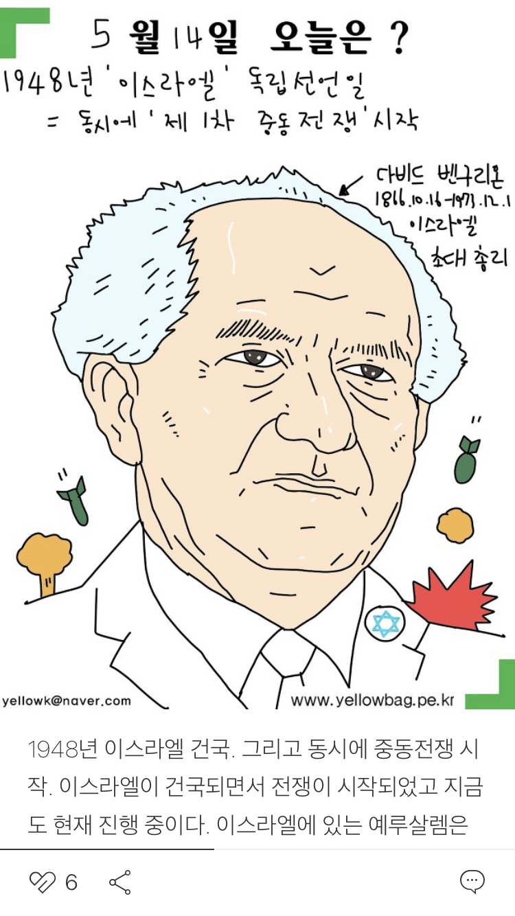 1948년 이스라엘 건국. 그리고 동시에 중동전쟁 시작. 이스라엘이 건국되면서 전쟁이 시작되었고 지금도 현재 진행 중이다. 이스라엘에 있는 예루살렘은 여러 종교의 성지이다. 어느 한민족, 어느 한종교의 땅도 아닌 곳을 자기 것이라 주장하고 땅을 점령하고 그동안 살아왔던 사람들을 내쫏고 죽이고 있다. 언제 전쟁이 끝나려는지...