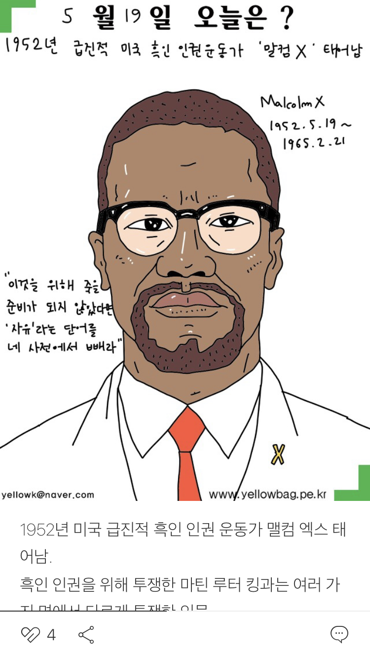 밑바닥 인생에서 무슬림이 되어 흑인 인권운동을 했고, 그가 몸담았던 이슬람 국가 운동 단체 중 한 명에게 암살당함. 1965년 2월 21일 39세 나이로 16발의 총탄을 맞고 죽음.