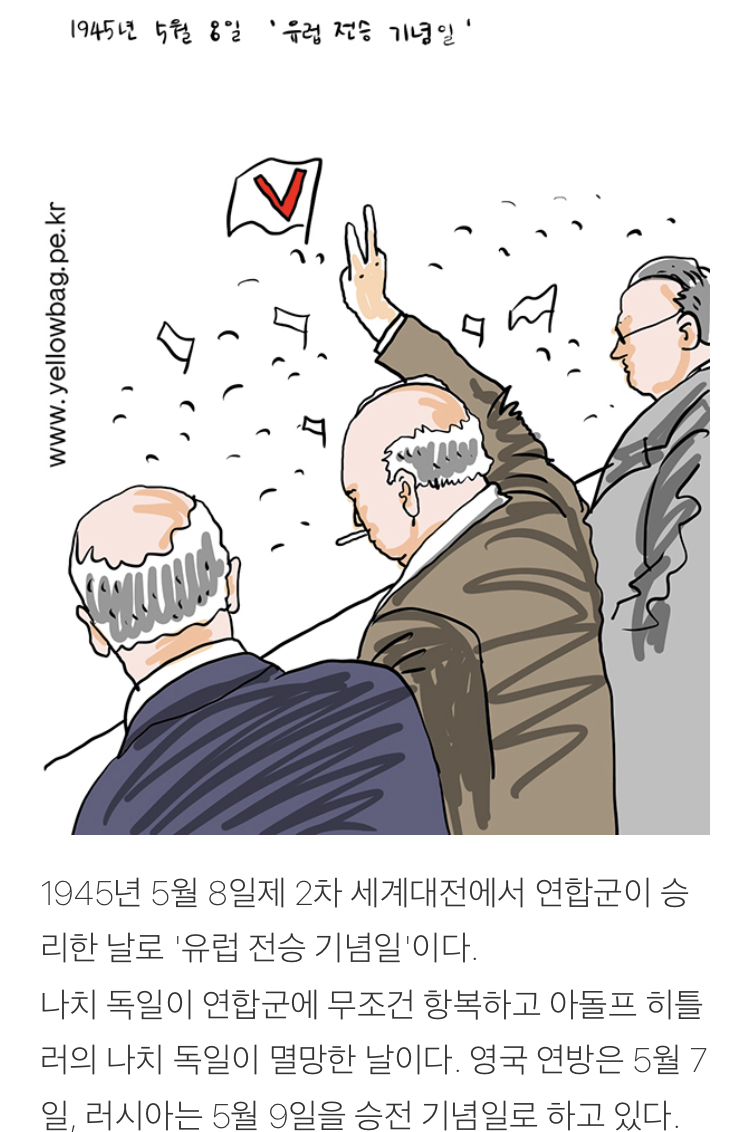 나치 독일이 연합군에 무조건 항복하고 아돌프 히틀러의 나치 독일이 멸망한 날이다. 영국 연방은 5월 7일, 러시아는 5월 9일을 승전 기념일로 하고 있다. 이 날은 런던에서부터 뉴욕까지 전 세계인들이 전쟁이 끝났음을 환호하였다. 런던에서는 트라팔가 광장과 버킹엄 궁전에서 여왕과 원스턴 처칠이, 미국에서는 약 한 달 전 사망한 루스벨트 대통령을 대신에 트루먼이 참석해 고 루스벨트 대통령에게 승리를 바쳤다. 우리나라의 8월 5일 광복절처럼 유럽의 많은 나라들이 5월 8일을 승리의 날을 공휴일로 하고 있다.