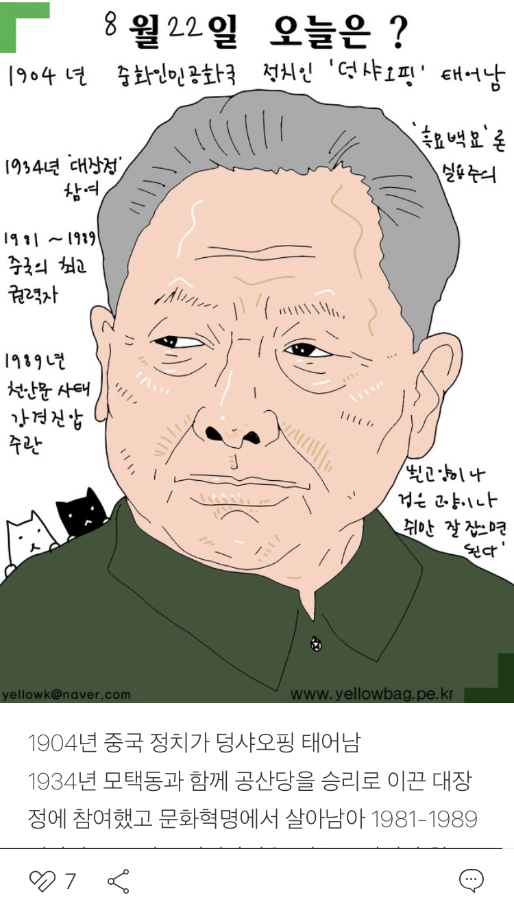 1934년 모택동과 함께 공산당을 승리로 이끈 대장정에 참여했고 문화혁명에서 살아남아 1981-1989년까지 중국 최고 권력자였음. 검은 고양이나 흰고양이나 쥐만 잘 잡으면 된다는 흑묘백묘 론으로 실용주의 노선으로 중국을 부흥시킴