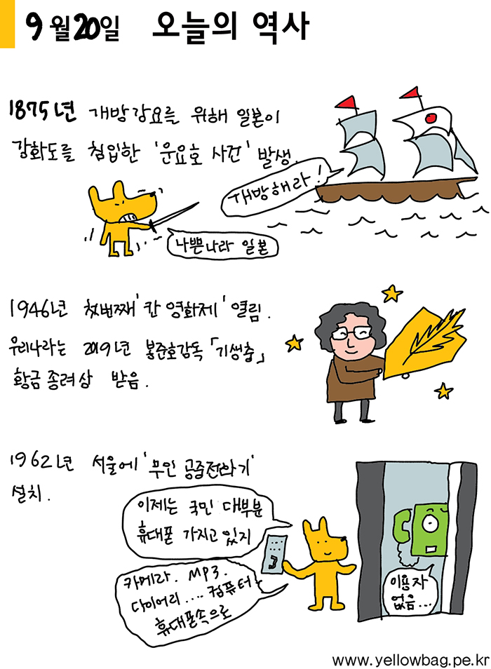 오늘의역사 9월 20일 오늘의 역사 노랑가방 2019. 9. 20. 10:37 1875년 운요호 사건 1946년 칸 영화제 시작 1962년 서울에 무인 공중전화기 설치 http://www.yellowbag.pe.kr/ https://www.instagram.com/yellowbag_min/ https://kimsangmin.creatorlink.net/