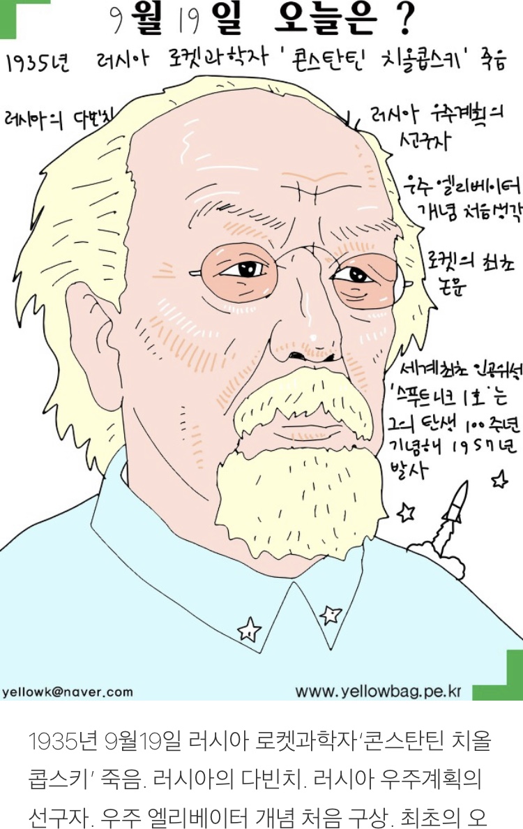 1935년 9월19일 러시아 로켓과학자‘콘스탄틴 치올콥스키’ 죽음. 러시아의 다빈치. 러시아 우주계획의 선구자. 우주 엘리베이터 개념 처음 구상. 최초의 오켓 논문. 세계최초의 인공위성 ‘스쿠니코프’ 그의 탄생 100주년 기념해 1957년 발사됨.
